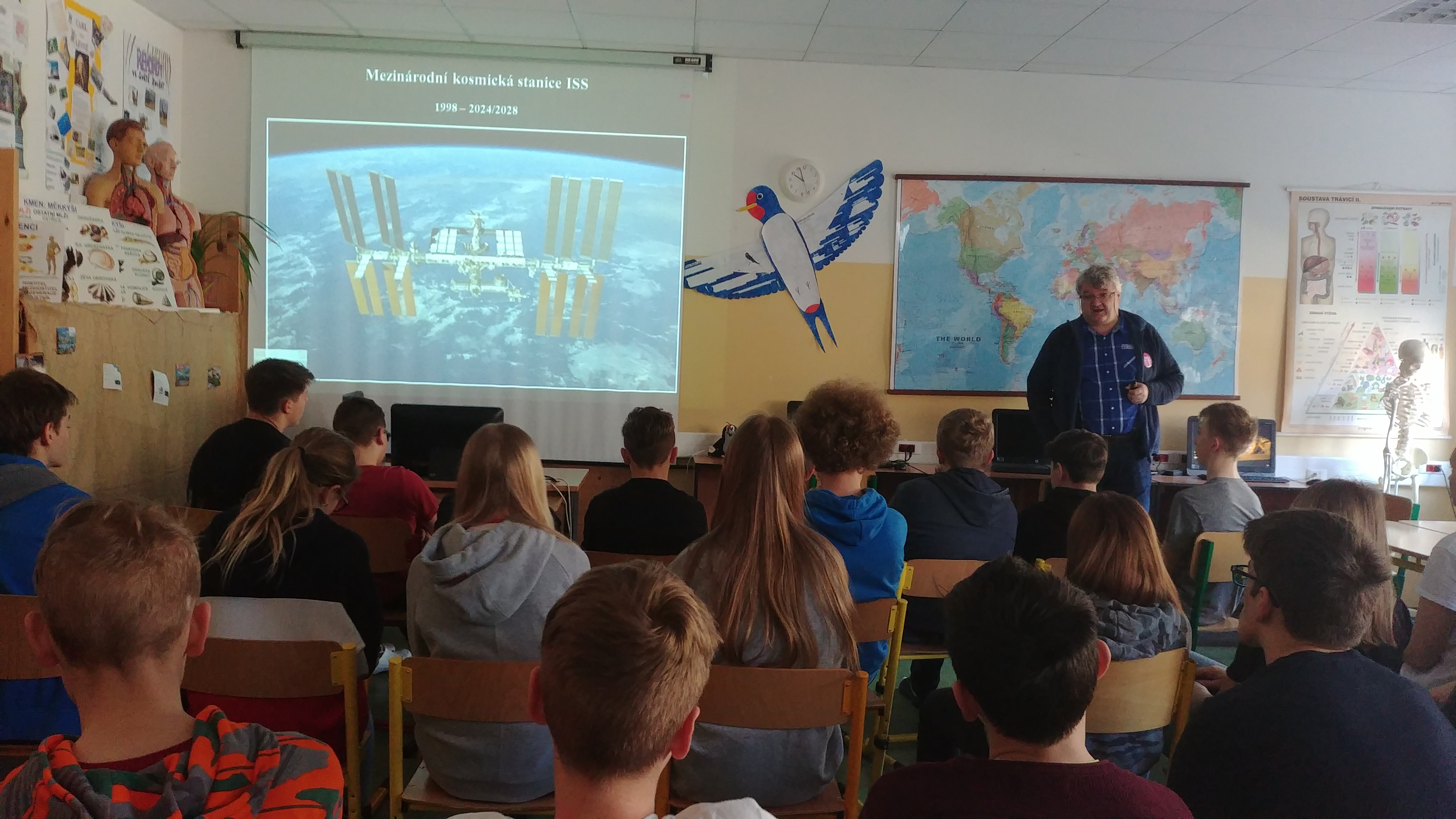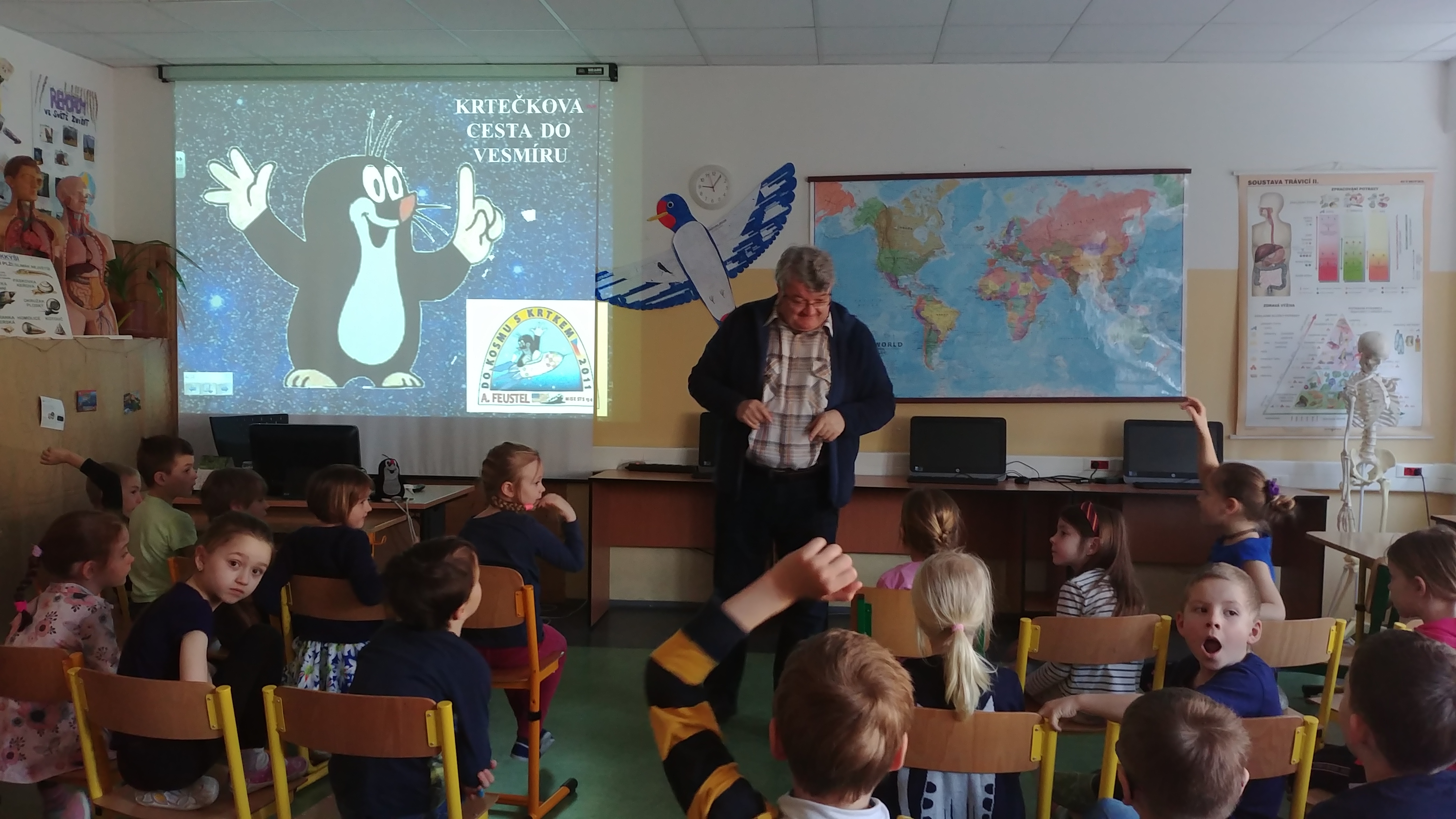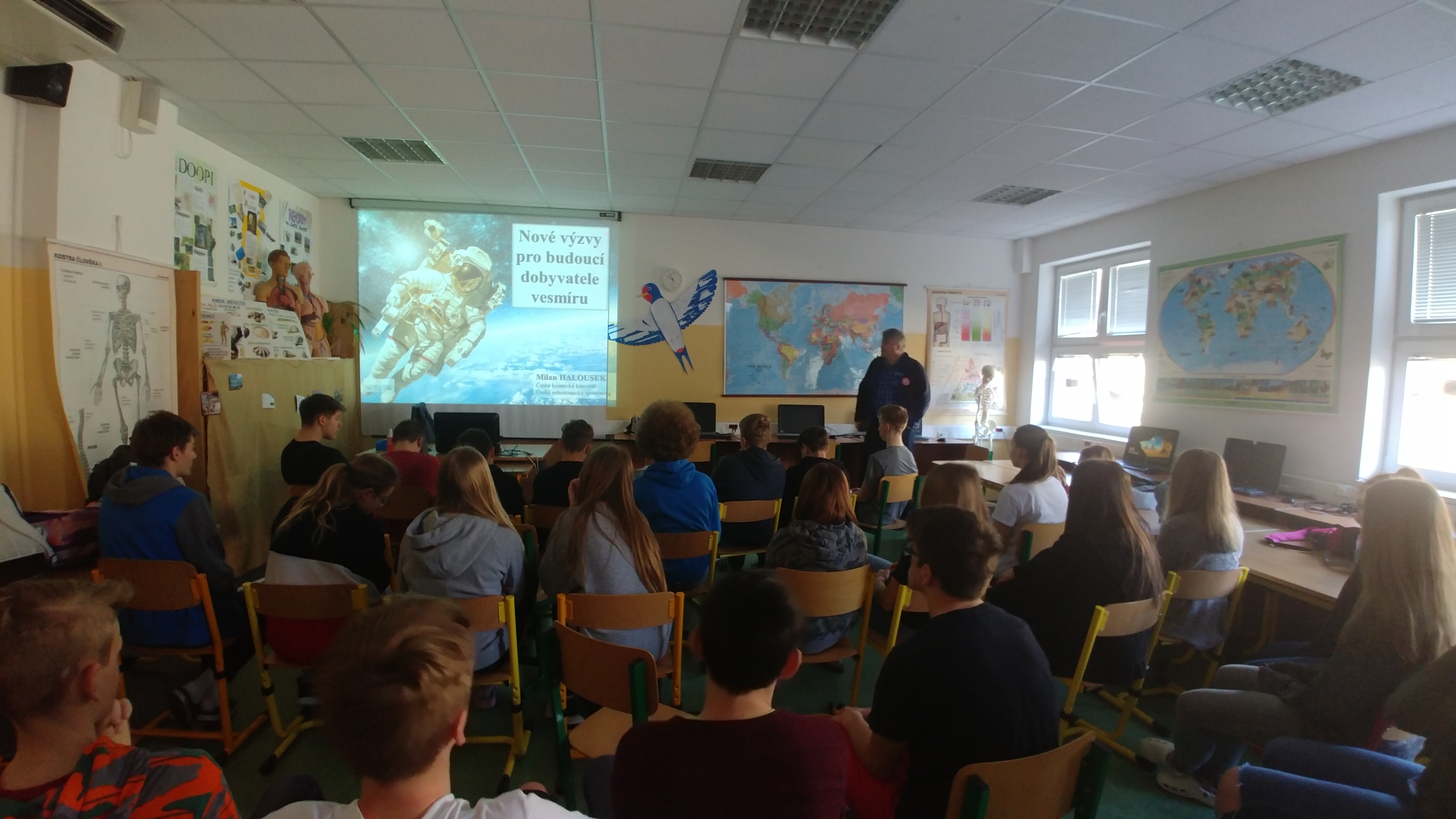 V několika dnech uplynulých týdnů navštívil všechny třídy naší školy pan Halousek z České kosmické kanceláře. Pro nižší ročníky měl připravený program nazvaný Do kosmu s Krtkem, pro vyšší ročníky pak téma Kosmonautika a my. Žáci se v první části přednášky seznámili s běžným dnem kosmonautů na orbitální stanici, s tím, jak si připravují své jídlo, jak a kam chodí na záchod, kde spí a jak odpočívají. V druhé polovině byli žáci vedeni k tomu, aby si uvědomili, co všechno spjaté s kosmonautikou člověk na Zemi využívá a používá.