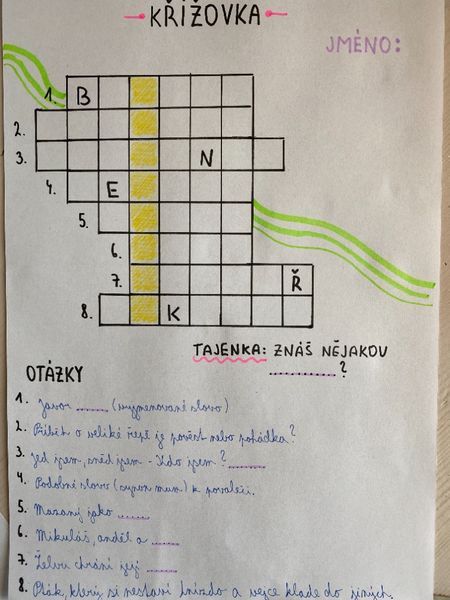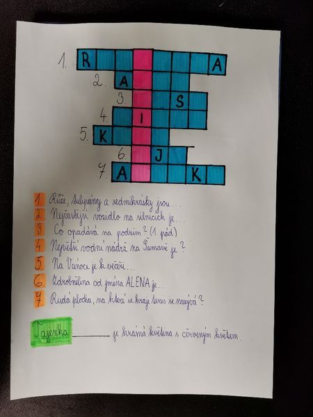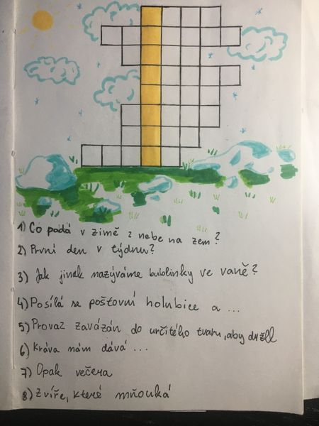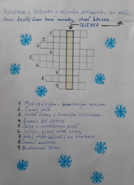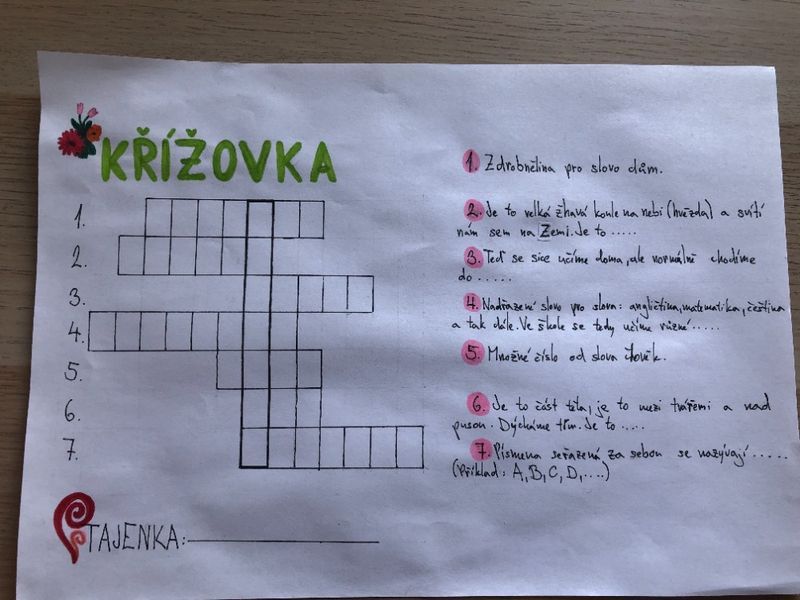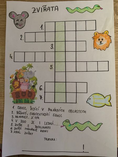 Doba výuky na dálku trvá a trvá a my na druhém stupni jsme v hodinách českého jazyka zavzpomínali na naše mladší spolužáky a připravili jim něco pro radost. V rámci slohové výchovy, u tématu „publicistika“, jsme se během dlouhých zimních večerů na chvíli vžili do role tvůrců dětského časopisu a pro žáky z vyšších ročníků prvního stupně zkusili, záměrně bez použití počítače, sestavovat křížovky s tajenkou. Předáme je přes paní učitelky a úspěšným řešitelům slibujeme malou odměnu, jen co se zase život vrátí trochu do normálních kolejí a s ním i školní docházka živě, tváří v tvář…