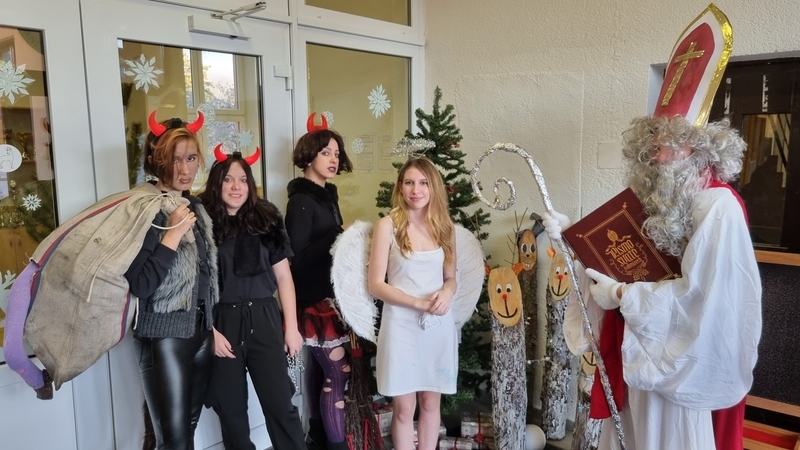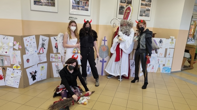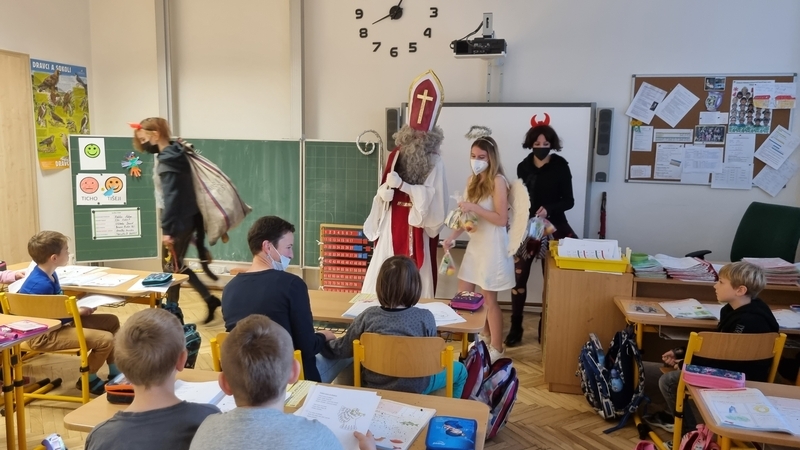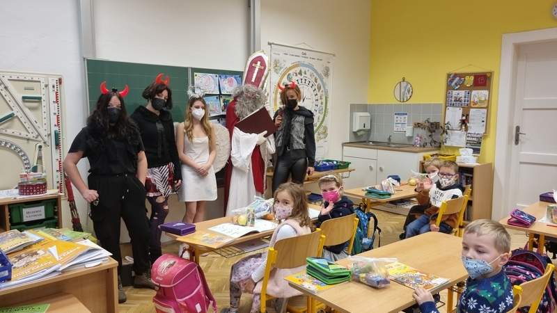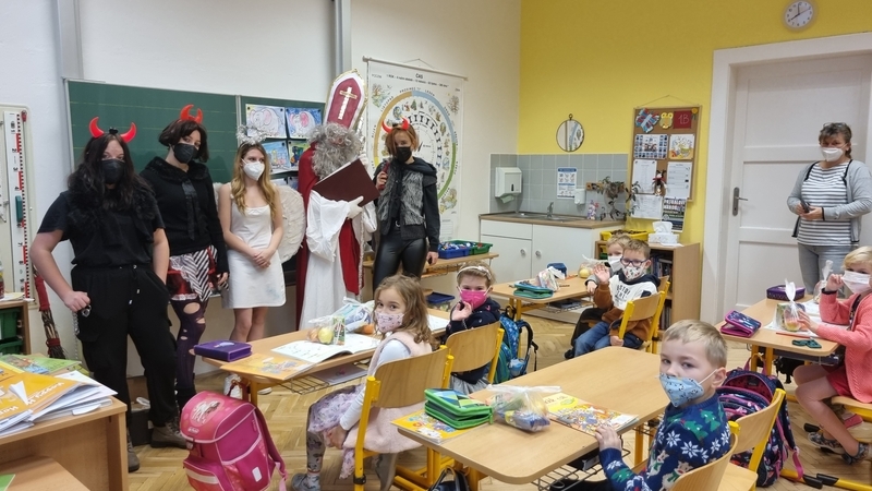 V pátek 3. 12. přišla do všech tříd 1. stupně, které nezasáhla karanténní opatření, krátká návštěva z nebeských výšin a pekla. Tentokrát se rolí Mikuláše, anděla a čertů ujala pětice žáků z 9. A. V Mikulášově knize hříchů a pochval se našlo místo pro každou třídu. Při zachování všech bezpečnostních a hygienických opatření se tak dočkali naši nejmladší tradiční mikulášské nadílky přímo z rukou těch nejpovolanějších- Mikuláše, anděla a čertů.