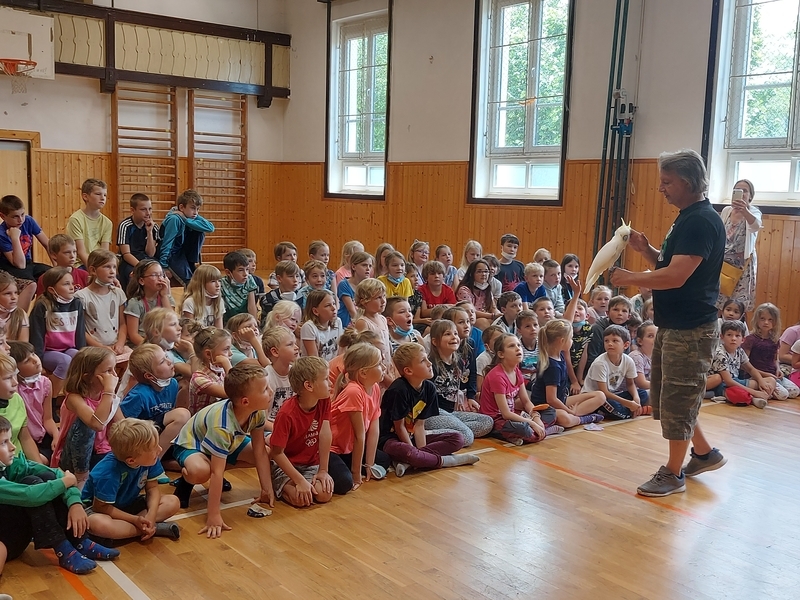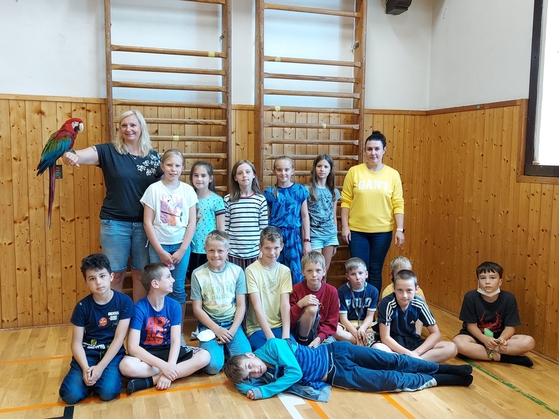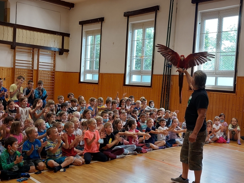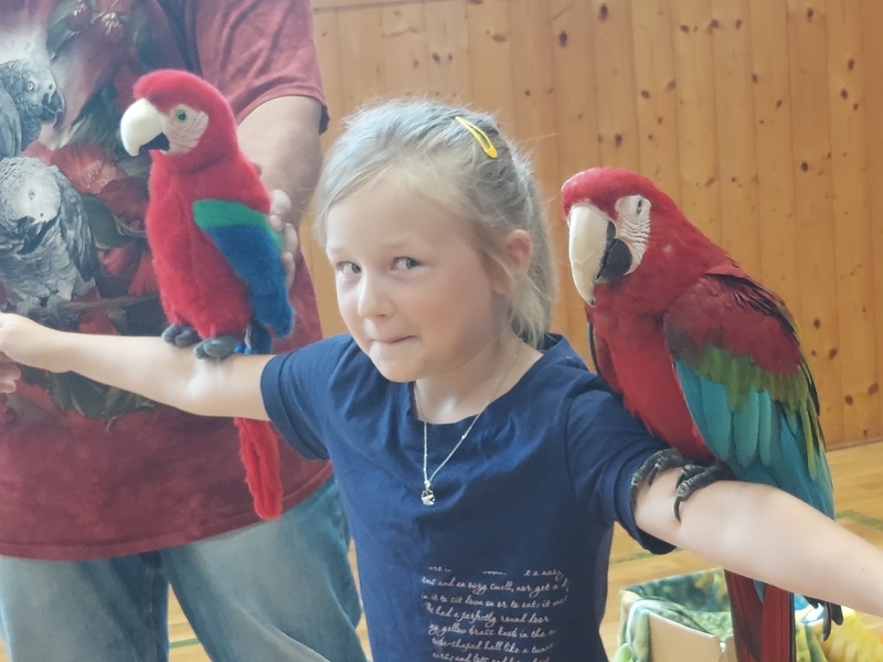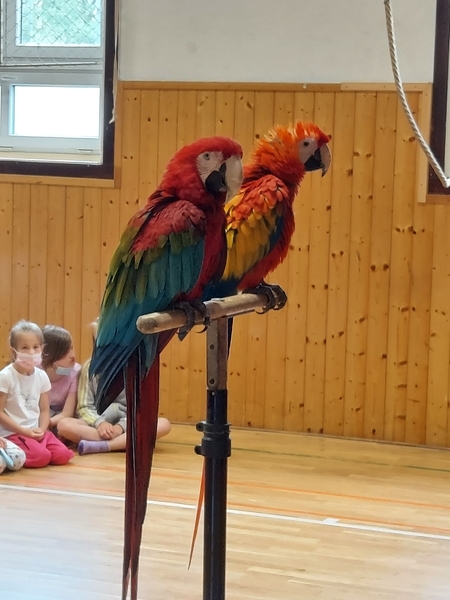 Ve čtvrtek 24. 6. 2021 nás „přiletěli“ navštívit dlouho očekávaní papoušci s panem Radkem Jarešem a jeho kolegou, kteří nám přivezli ukázat různé druhy papoušků: kakadu, papouška šedého, korelu nebo ary, dokonce i papouščí „miminka“. Děti si vystoupení moc užily, dozvěděly se mnoho zajímavých informací. Papoušci předváděli nejrůznější veselé kousky, takže byla i legrace.
