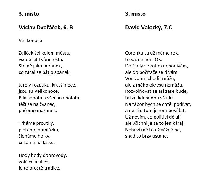 3. místo – Václav Dvořáček ( 6.B s básní Velikonoce) a David Valocký ( 7.C)