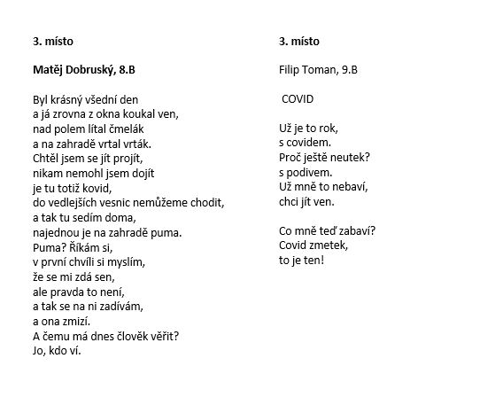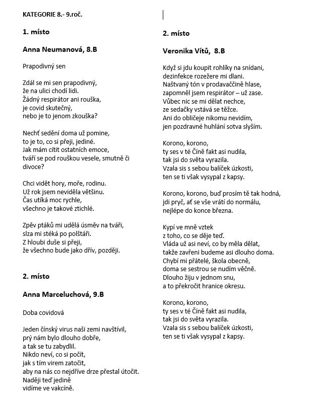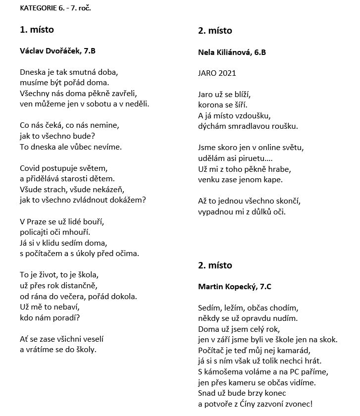 Tradiční soutěž v hlasité recitaci básní před publikem nazvaná Papoušek se již druhým rokem nemohla uskutečnit, a tak školní knihovna přišla s novou výzvou, aby žáci 2. stupně poezii sami tvořili. Nešlo jen o to zachovat tradici, ale hlavně nabídnout dětem možnost vyjádření pocitů, nálad a snů jako reakci na těžké chvíle, které prožívají, nebo naopak vyjádření radosti z jara a Velikonoc. Mile nás překvapilo, že se zúčastnilo 14 autorů. Paní učitelky českého jazyka