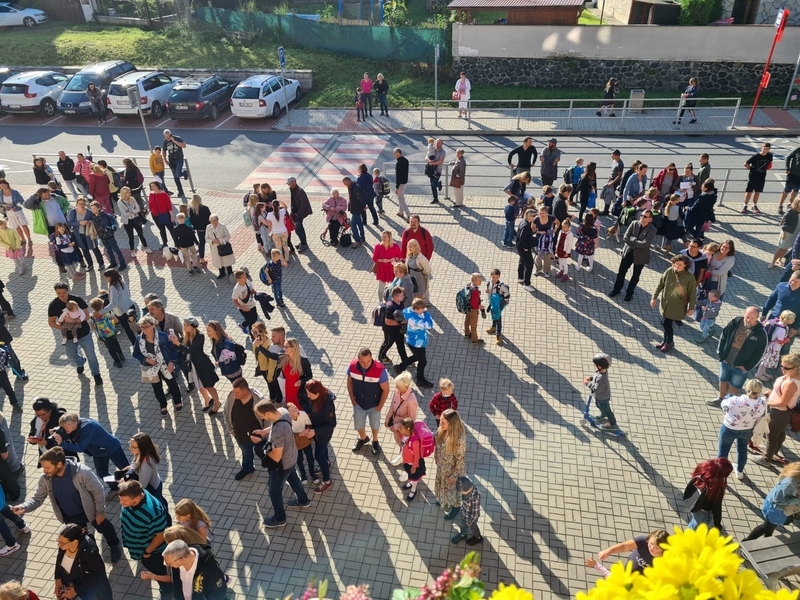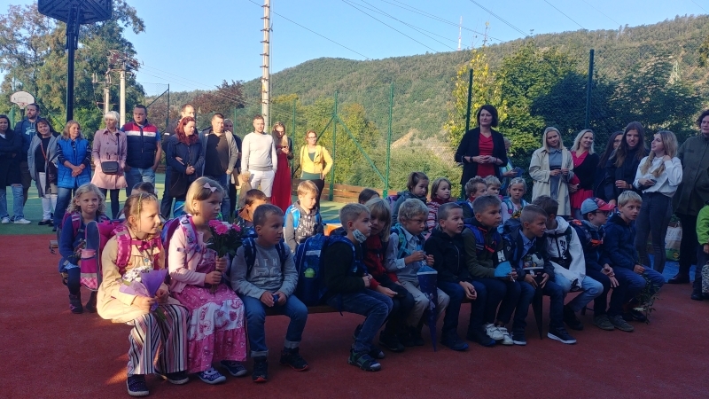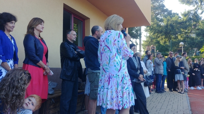 Slavnostní den byl zahájen na školním hřišti, kde vedení naší školy a paní starostka přivítali děti spolu s rodiči, kteří je doprovázeli a popřáli jim úspěšný nový školní rok.