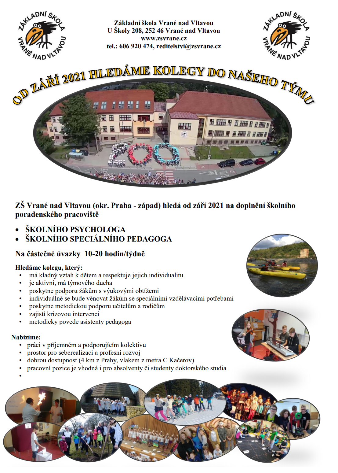 Volné pracovní místo Post published:30.6.2021 ZŠ Vrané nad Vltavou hledá od září 2021 na doplnění školního poradenského pracoviště školního psychologa a školního speciálního pedagoga. Read more articles Previous PostČtení a hry od deváťáků prvňáčkůmNext PostKrásné prázdniny You Might Also Like Změny jízdních řádů k 11. 12. 2022 6.12.2022 Provoz školy od 4.1.2021 29.12.2020 Třídy 6. A a 7. B už si zvolily svého prezidenta 16.1.2023